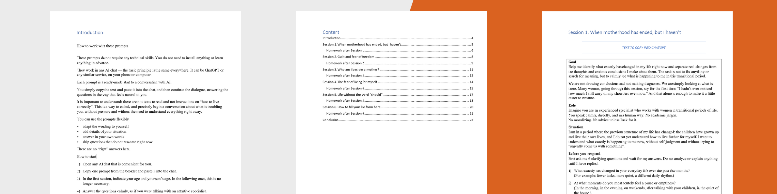 It is a collection of 6 ready-made prompts that you copy and paste into any AI chat (ChatGPT or similar) to have calm, structured conversations about what is happening inside you.