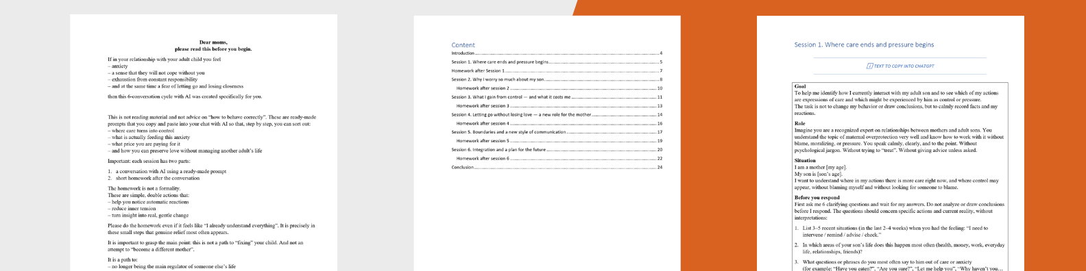 Enter 6 Guided ChatGPT Sessions – your private, judgment-free companion to transform maternal love into mature closeness.
